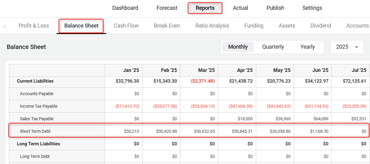 Because you can both use your Line of Credit and make a payment on it in the same month, the Balance Sheet will calculate the net debt that remains each month. This amount is shown as part of the Current Liabilities, as Short-Term Debt: