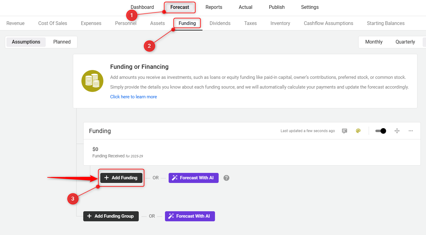 Under the Forecast tab of the Finance Forecasting Module, click on the Funding tab, and then click on the Add Funding option: