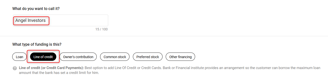 Enter a name for the loan, and select the funding type as Line of Credit: