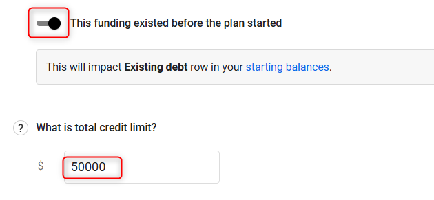 Toggle the switch if this funding existed before the plan started, and enter the limit of the line of credit: