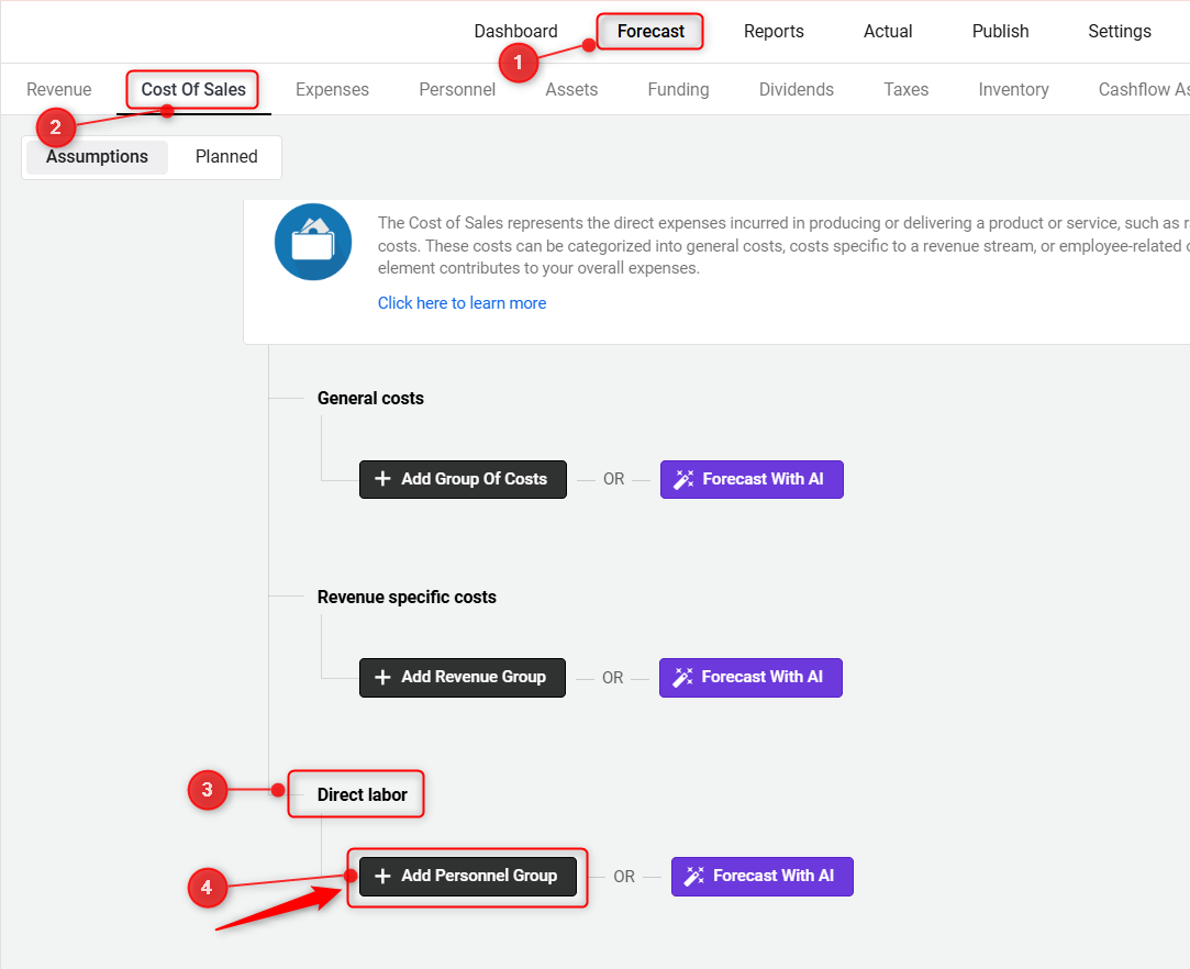 By following these steps, you can easily allocate direct labor costs to the Cost of Sales section in your finances. This ensures that your financial forecasting reflects the true cost of production and services, providing you with a clearer financial picture.