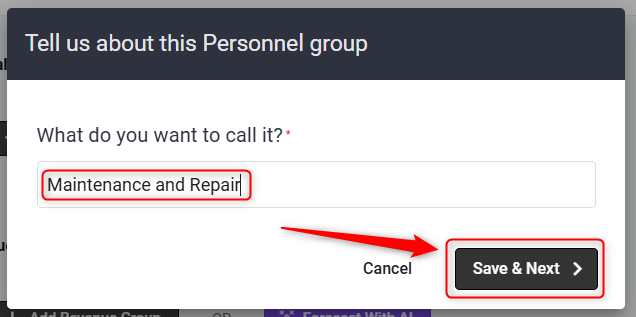 In the overlay that appears, enter the Personnel Group title and click on Save & Next. An overlay appears. To start adding personnel, go to Step 3 or close the overlay to check the Maintenance and Repair Personnel Group you just created.