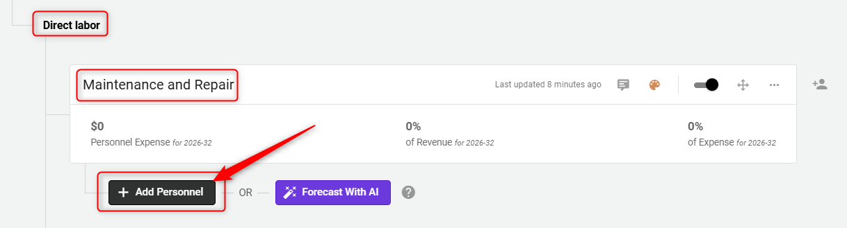 In your Finance Forecasting module, navigate to the Cost of Sales tab and scroll down to Direct Labor. Click on the Add Personnel Group option: