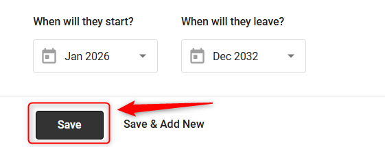 Time Duration: Then indicate when the employee(s) will start/join and terminate their job. Then click on Save.