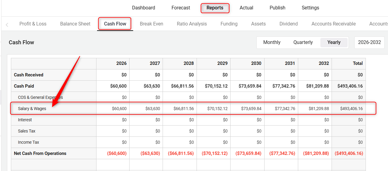 Your Personnel cost of sale will be used to calculate the highlighted lines in the Profit & Loss and Cash Flow table shown below: