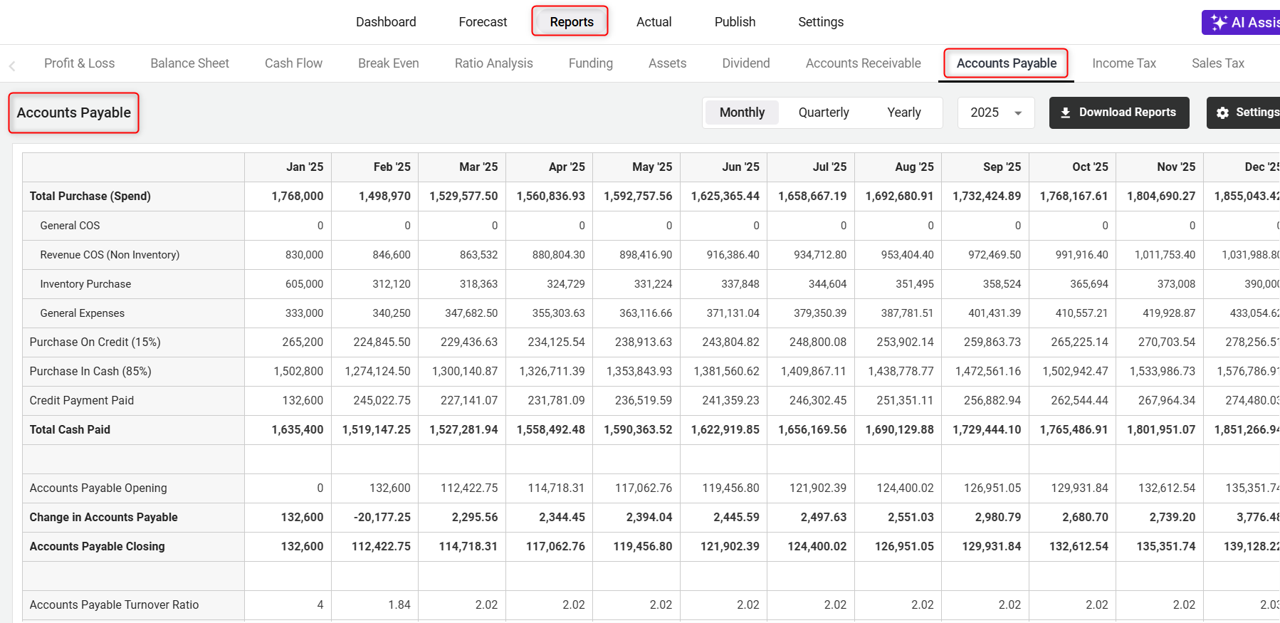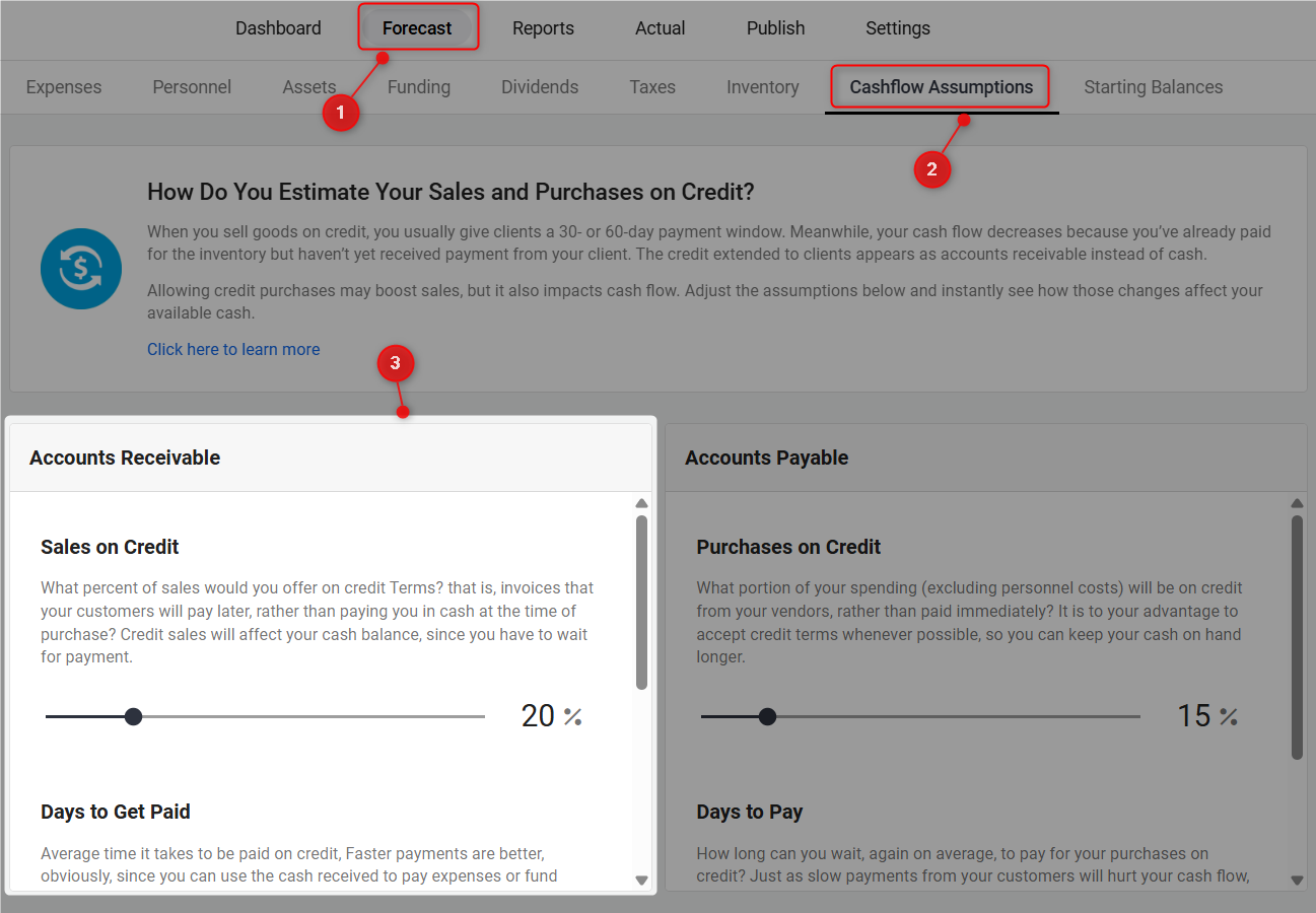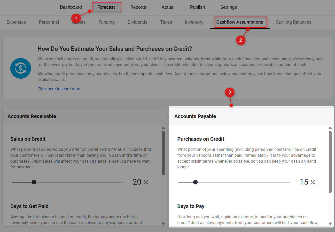 There are two methods for forecasting your accounts receivable and accounts payable. You can set an average percentage of your sales on credit for all of your revenue and an average percentage of your purchases on credit for all of your expenses. If you would like more precision in your cash flow assumptions, you can set your accounts receivable terms according to your individual revenue streams. Likewise, you can do the same for your accounts payable to fine-tune your assumptions for individual regular expenses.