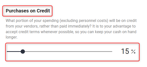 Estimate the portion of your spending that will be on credit from your vendors, rather than being paid immediately. Use the Purchases on credit slider to indicate the percentage of your purchases you will make with credit: