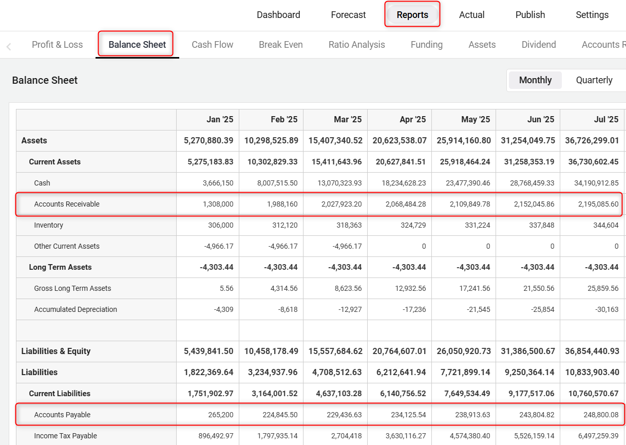 In the Balance Sheet, your Accounts Receivable and Accounts Payable will appear as shown below: