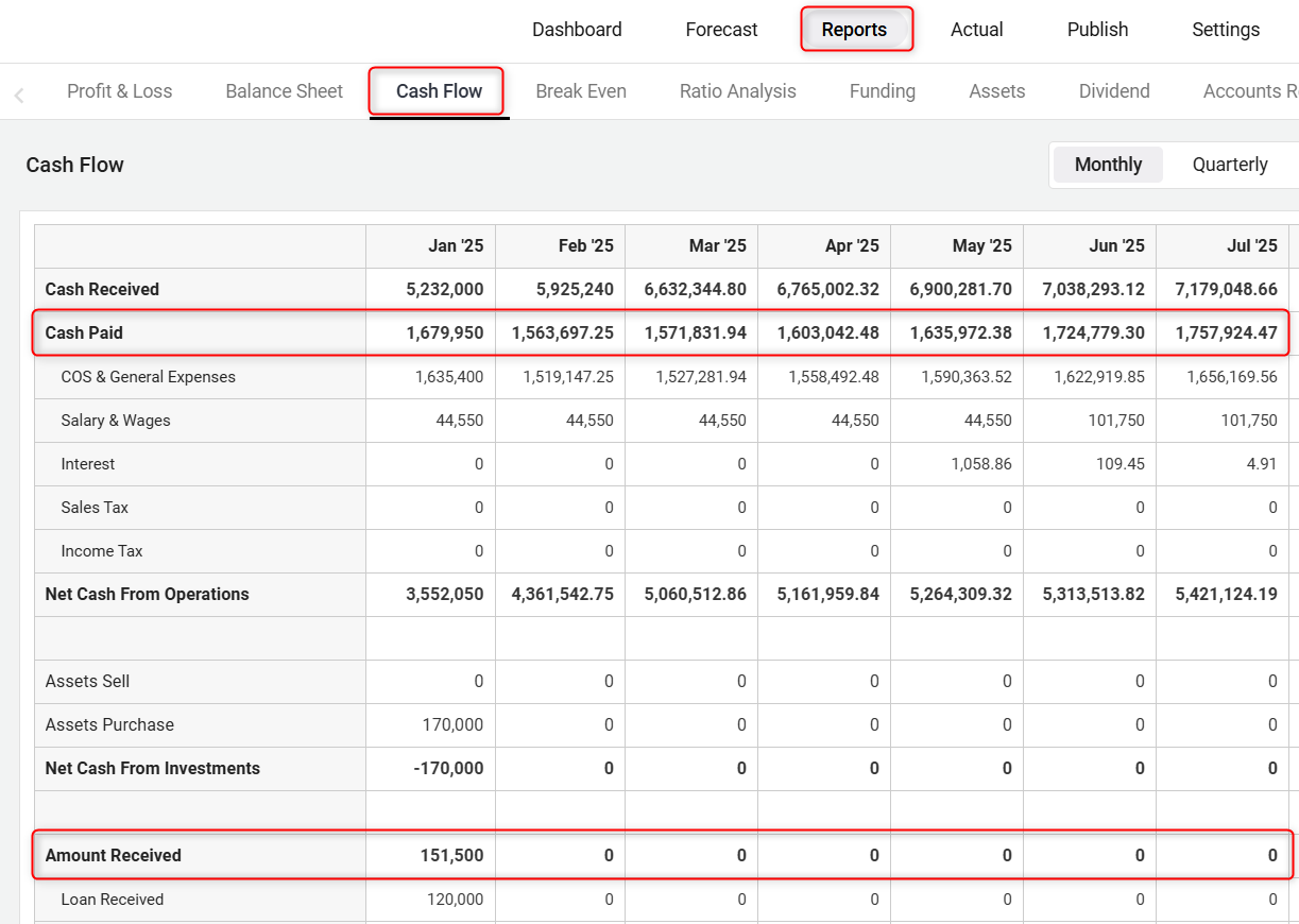 In the Cash Flow, accounts receivable and payable will appear under Cash Paid and Amount Received, meaning the amount of increase or decrease in accounts receivable or payable each period. If you see a zero listed here, it doesn't mean there were no receivables or payables; it means there was no change in them: