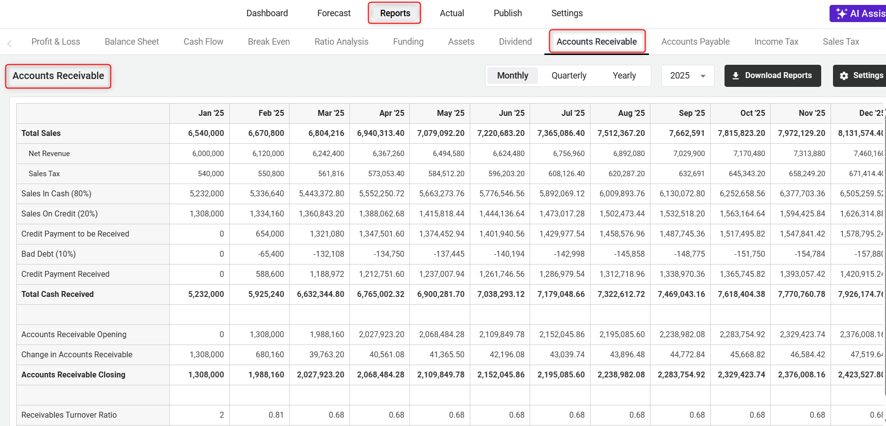 To set up your accounts receivable in your finance, navigate to the Cashflow Assumptions tab located under the Forecast option, which will direct you to the configuration window.